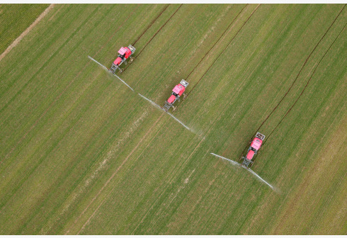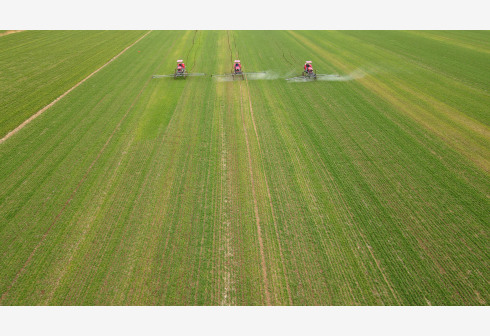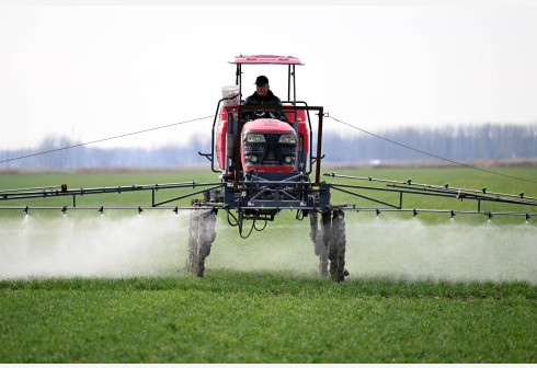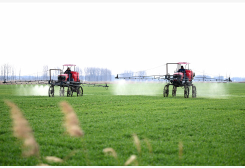 2月14日,在安徽省蚌埠市五河县头铺镇,农民驾驶农机给小麦喷洒农药。近日,安徽省蚌埠市五河县头铺镇村民抢抓农时进行小麦春管作业,田间地头一派农忙景象。新华社记者 黄博涵 摄