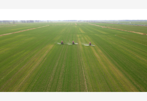 2月14日,在安徽省蚌埠市五河县头铺镇,农民驾驶农机给小麦喷洒农药(无人机照片)。近日,安徽省蚌埠市五河县头铺镇村民抢抓农时进行小麦春管作业,田间地头一派农忙景象。新华社记者 黄博涵 摄