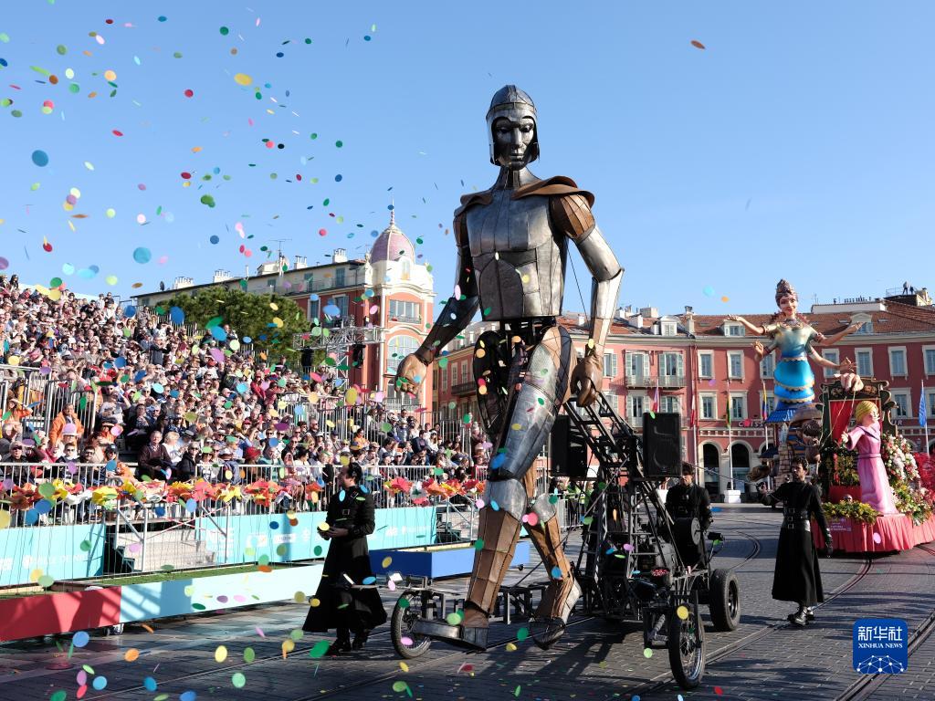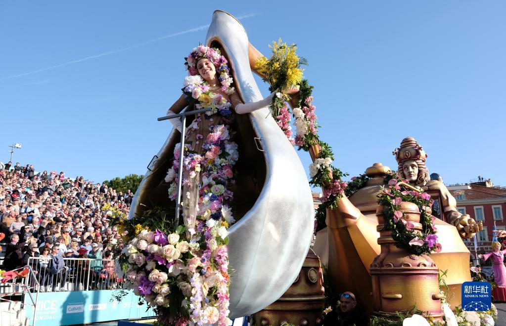 这是2月15日在法国尼斯狂欢节“鲜花大战”活动中拍摄的花车和表演者。第138届法国尼斯狂欢节2月10日至26日举行。在狂欢节15日举办的“鲜花大战”活动中,表演者站在鲜花装饰的彩车上将鲜花抛向观众。 新华社发(塞尔日·阿乌齐摄)