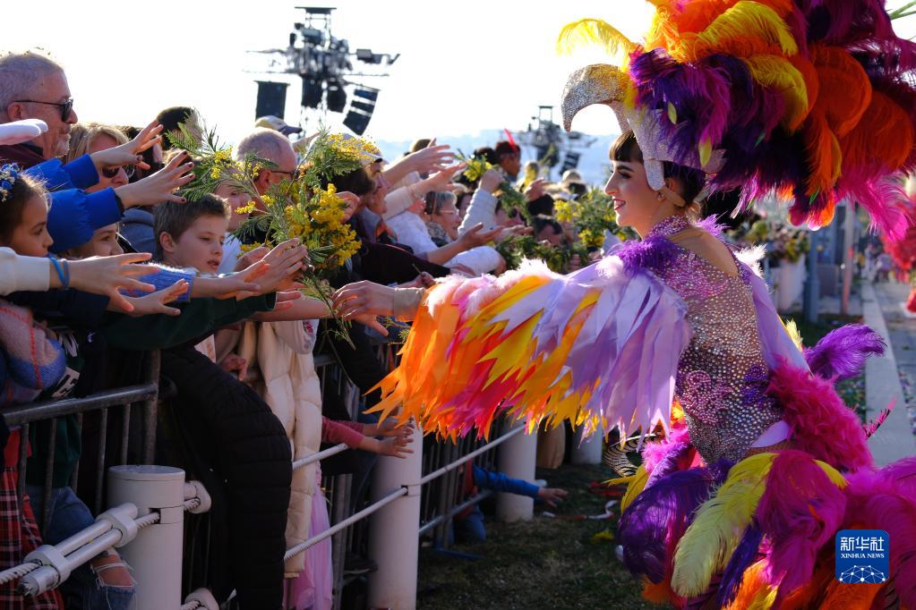 2月15日,在法国尼斯狂欢节“鲜花大战”活动中,表演者与观众互动。第138届法国尼斯狂欢节2月10日至26日举行。在狂欢节15日举办的“鲜花大战”活动中,表演者站在鲜花装饰的彩车上将鲜花抛向观众。 新华社发(塞尔日·阿乌齐摄)