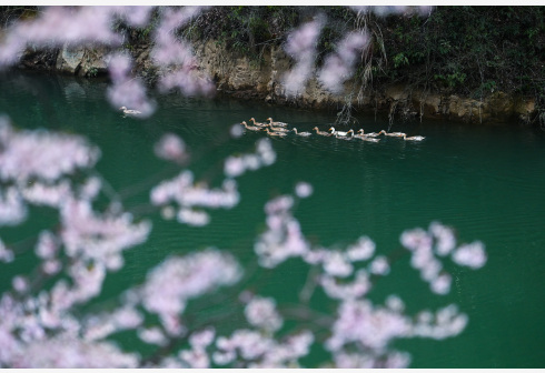 三都镇大唐村池塘里的鸭子与盛开的野樱花相映成景(3月1日摄)。新华社记者 徐昱 摄
