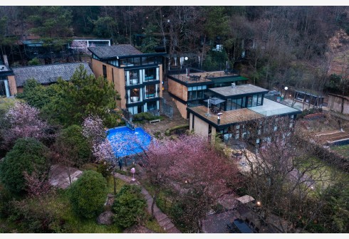 2月28日拍摄的三都镇前源村山顶一家被樱花树包围的民宿(无人机照片)。新华社记者 徐昱 摄