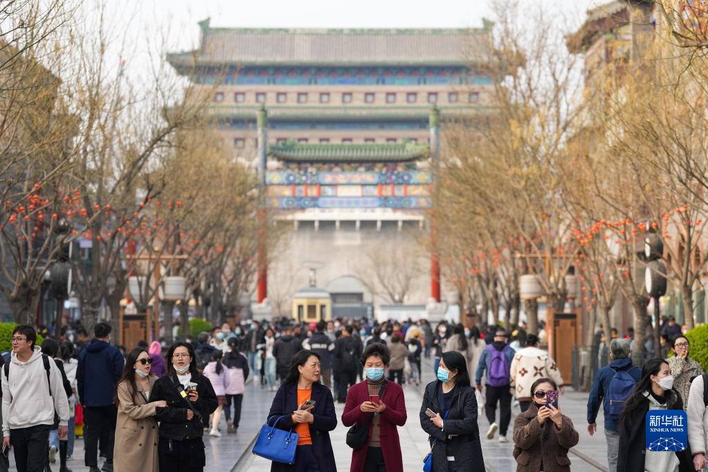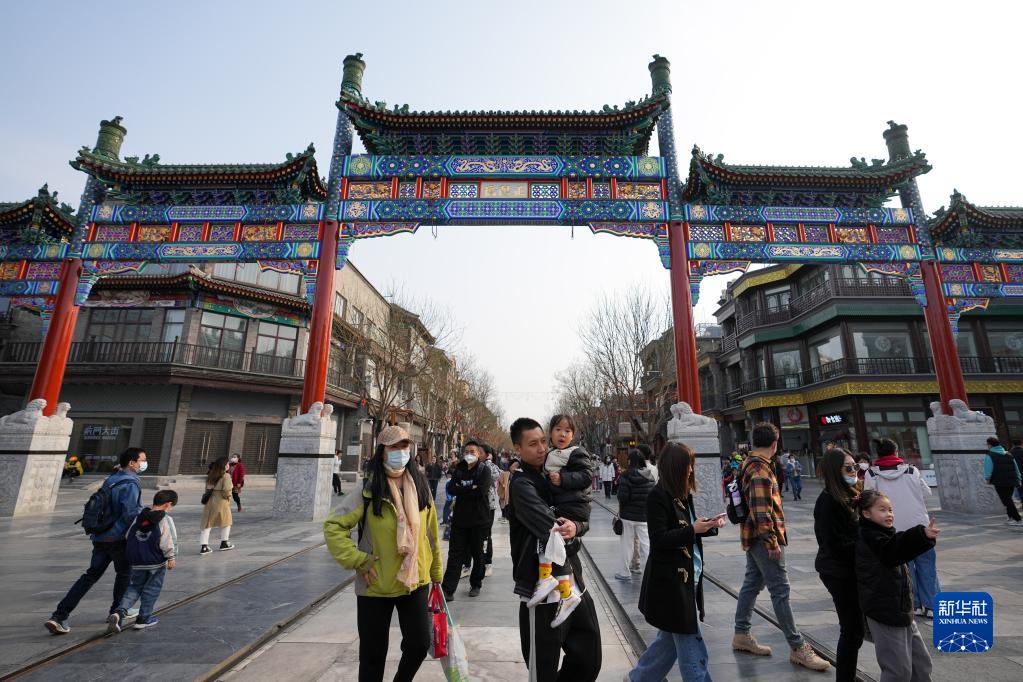 3月19日,游客在北京前门大街游览。 当日,北京前门大街商圈游人如织,众多市民游客在这里参观游览。 新华社记者 鞠焕宗 摄
