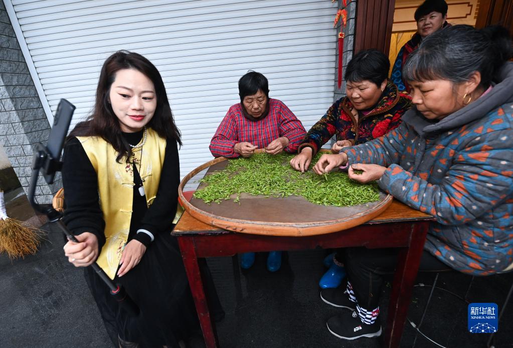 3月22日,一名女子在诸暨市赵家镇东庄村上阳自然村直播高山有机茶的制作情况,助力网上销售。 新华社记者 徐昱 摄
