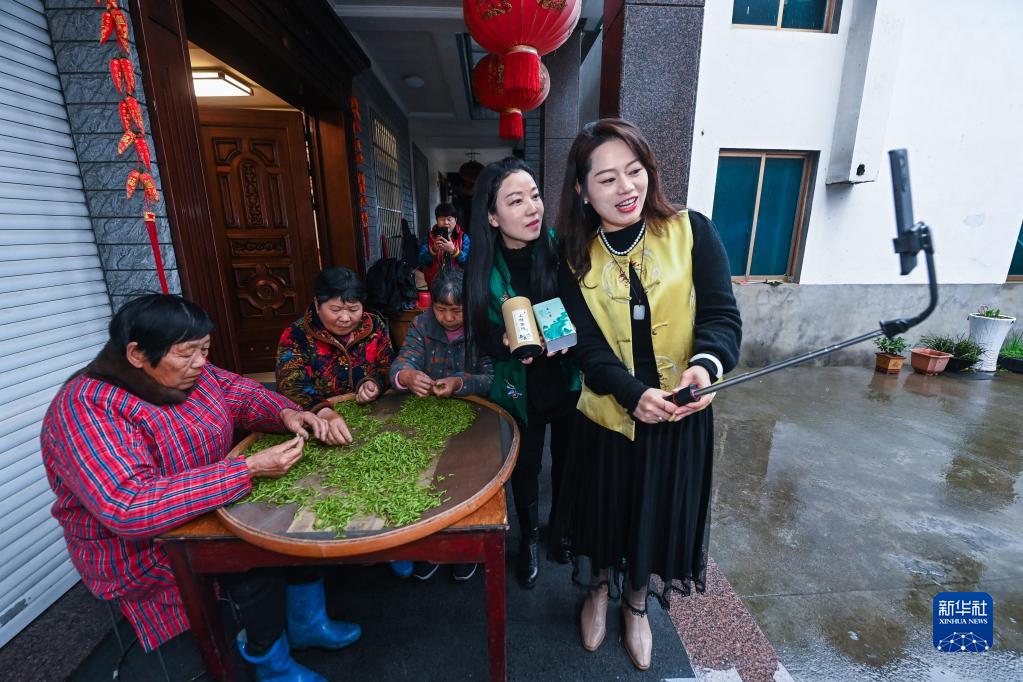 3月22日,两名女子在诸暨市赵家镇东庄村上阳自然村直播高山有机茶制作,助力网上销售。正值采茶季节,浙江省诸暨市赵家镇东庄村上阳自然村的空气里浸润着茶香,茶农们忙着炒制高山有机茶,通过村里的“共富工坊”以统一品牌销售。近年来,地处海拔400多米的赵家镇东庄村成立“手工茶共富工坊”,注册统一的高山茶品牌,制定统一的种植及收购标准,目前已吸引当地100多户茶农参与。赵家镇现有茶叶面积7600多亩,每亩年产茶叶成品约100斤,茶农户均年增收约1万元。新华社记者 徐昱 摄