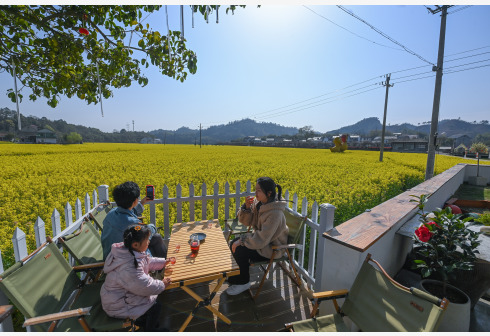 3月28日,在杭州市临安区太阳镇太阳米基地旁的一家民宿餐厅,客人在院子里喝茶赏景。新华社记者 徐昱 摄