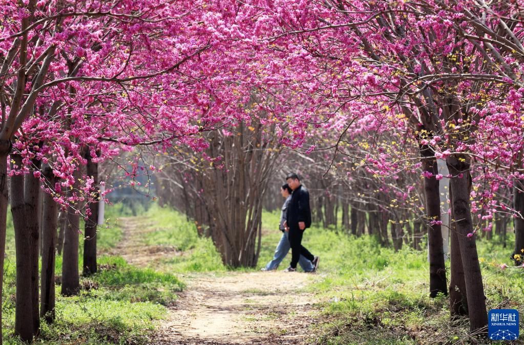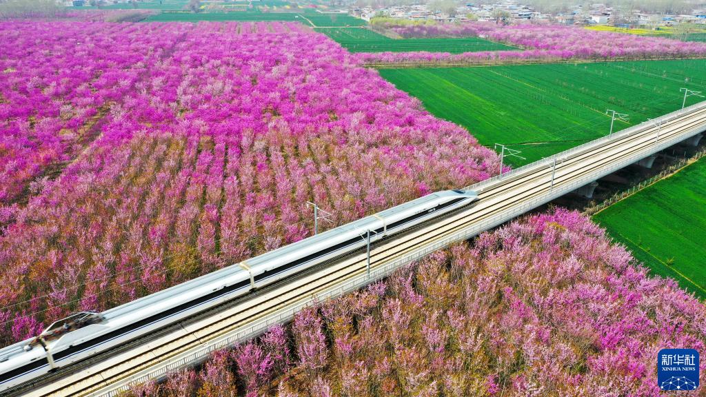 3月27日,高铁列车从许昌市建安区小召乡紫荆花海中驶过(无人机照片)。 眼下,河南省许昌市建安区小召乡约200亩紫荆进入盛花期,吸引众多游客前来踏青赏花。 新华社发(牛书培 摄)