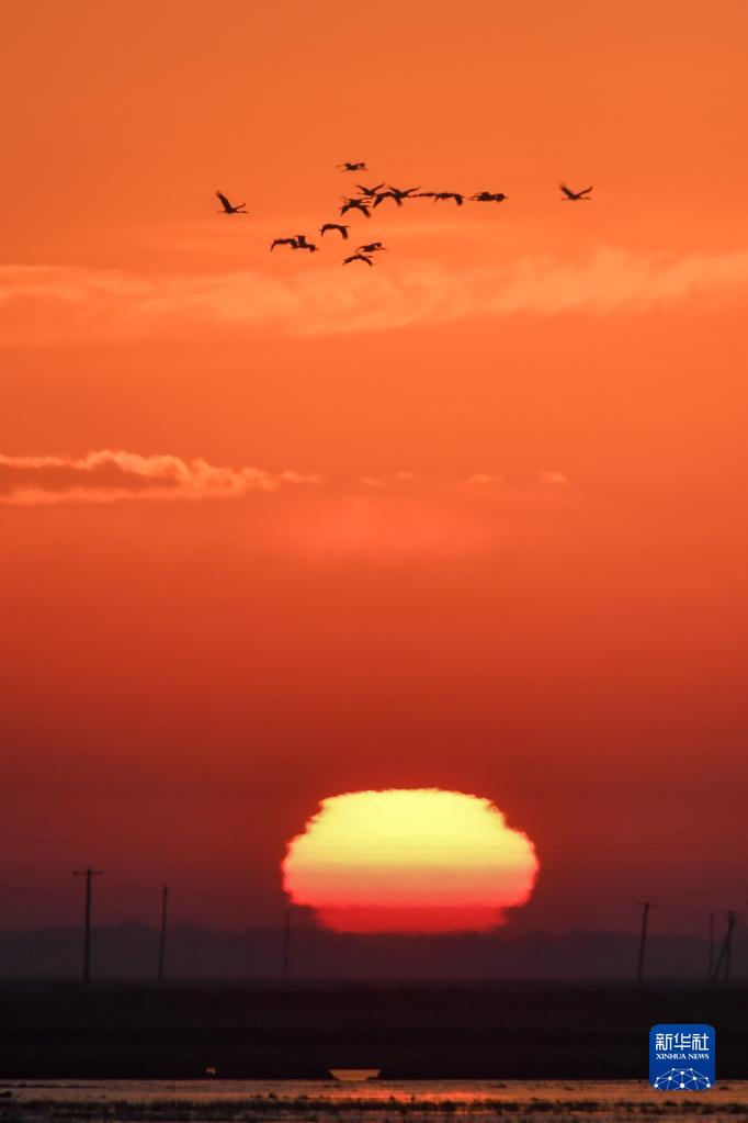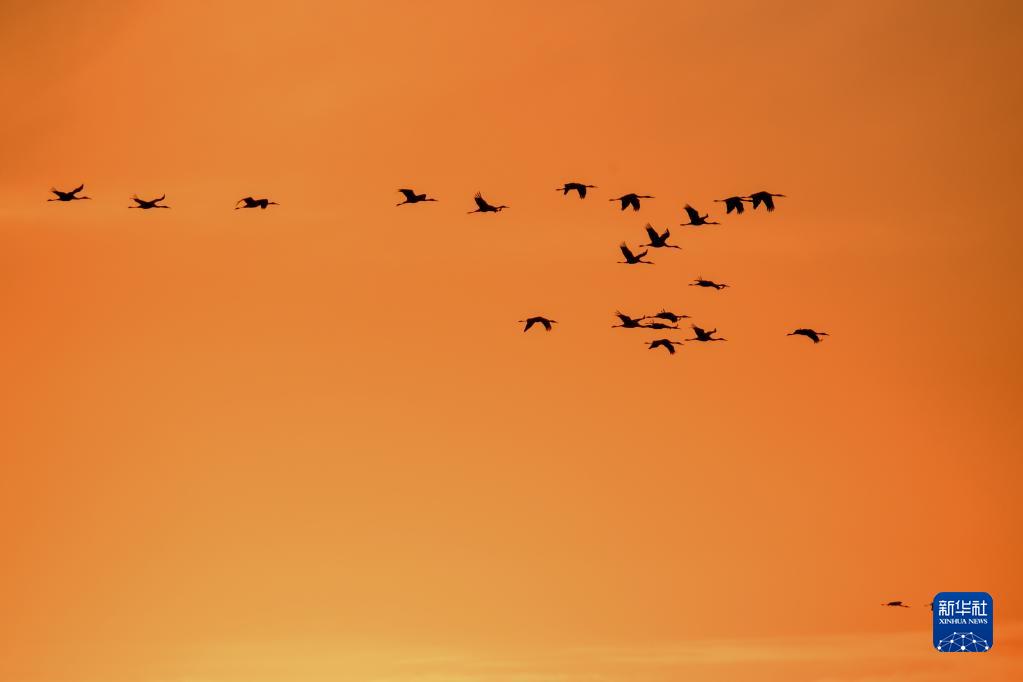 3月29日,在吉林省白城市镇赉县,一群候鸟从湿地上空飞过。 近日,大批北归候鸟来到吉林省白城市镇赉县湿地停歇、觅食。镇赉县地处松嫩平原,是候鸟迁徙通道上的重要停歇地。每年春秋两季吸引包括白鹤、大雁、野鸭等在内的几十万只候鸟经此过境。近年来,镇赉县积极推进“河湖连通”“退耕还湿”“湿地修复”等生态工程,为候鸟迁徙提供了优良的环境。 新华社记者 张楠 摄
