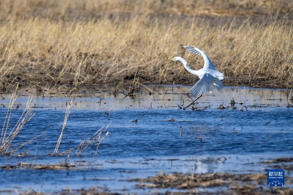 3月28日,在吉林省白城市镇赉县,一只大白鹭在湿地栖息。 近日,大批北归候鸟来到吉林省白城市镇赉县湿地停歇、觅食。镇赉县地处松嫩平原,是候鸟迁徙通道上的重要停歇地。每年春秋两季吸引包括白鹤、大雁、野鸭等在内的几十万只候鸟经此过境。近年来,镇赉县积极推进“河湖连通”“退耕还湿”“湿地修复”等生态工程,为候鸟迁徙提供了优良的环境。 新华社记者 张楠 摄