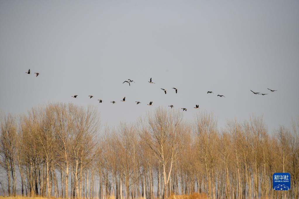 3月28日,在吉林省白城市镇赉县,一群豆雁从树林上空飞过。 近日,大批北归候鸟来到吉林省白城市镇赉县湿地停歇、觅食。镇赉县地处松嫩平原,是候鸟迁徙通道上的重要停歇地。每年春秋两季吸引包括白鹤、大雁、野鸭等在内的几十万只候鸟经此过境。近年来,镇赉县积极推进“河湖连通”“退耕还湿”“湿地修复”等生态工程,为候鸟迁徙提供了优良的环境。 新华社记者 张楠 摄