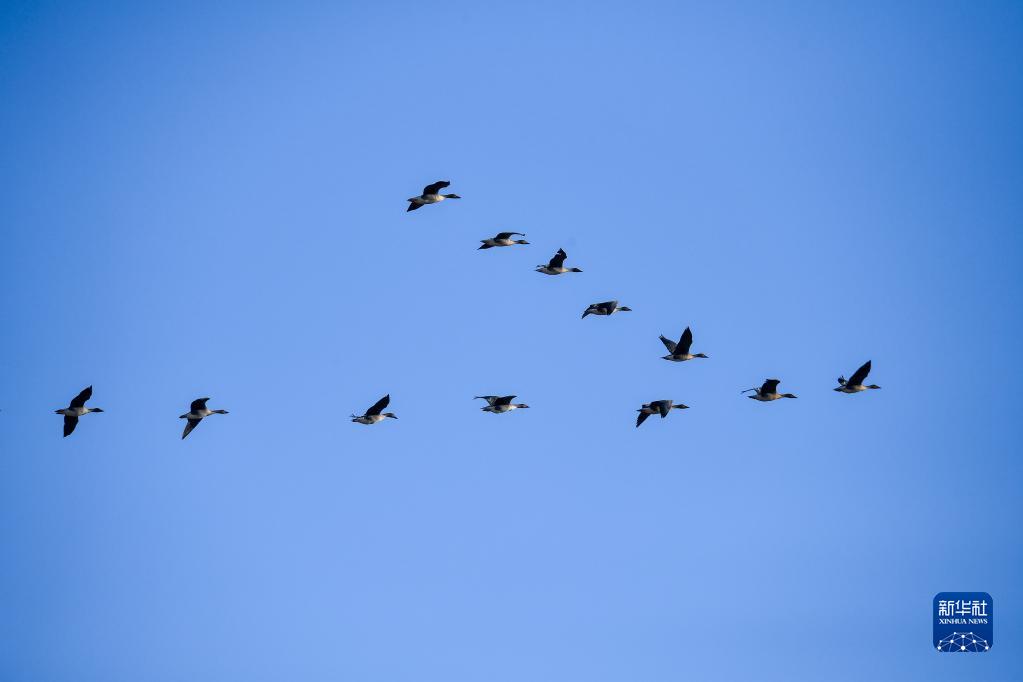 3月28日,在吉林省白城市镇赉县,一群豆雁从湿地上空飞过。 近日,大批北归候鸟来到吉林省白城市镇赉县湿地停歇、觅食。镇赉县地处松嫩平原,是候鸟迁徙通道上的重要停歇地。每年春秋两季吸引包括白鹤、大雁、野鸭等在内的几十万只候鸟经此过境。近年来,镇赉县积极推进“河湖连通”“退耕还湿”“湿地修复”等生态工程,为候鸟迁徙提供了优良的环境。 新华社记者 张楠 摄