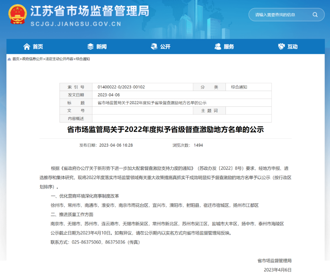 公示截止日期为2023年4月10日。如有异议,请在公示期内以实名方式向省市场监督管理局反映。联系方式:025-86375060,86375036(传真)