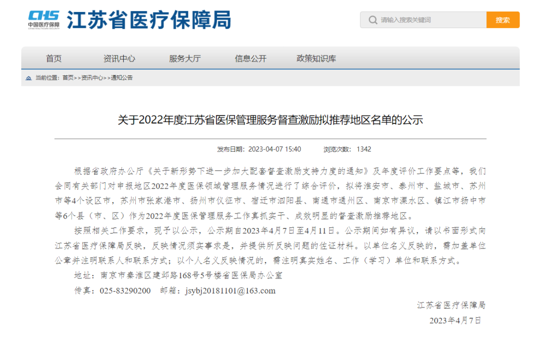 根据省政府办公厅《关于新形势下进一步加大配套督查激励支持力度的通知》及年度评价工作要点等,我们会同有关部门对申报地区2022年度医保领域管理服务情况进行了综合评价,拟将淮安市、泰州市、盐城市、苏州市等4个设区市,苏州市张家港市、扬州市仪征市、宿迁市泗阳县、南通市通州区、南京市溧水区、镇江市扬中市等6个县(市、区)作为2022年度医保管理服务工作真抓实干、成效明显的督查激励推荐地区。按照相关工作要求,现予以公示,公示期自2023年4月7日至4月11日。公示期间如有异议,请以书面形式向江苏省医疗保障局反映,反映情况须实事求是,并提供所反映问题的佐证材料。以单位名义反映的,需加盖单位公章并注明联系人和联系方式;以个人名义反映情况的,需注明真实姓名、工作(学习)单位和联系方式。地址:南京市秦淮区建邺路168号5号楼省医保局办公室传真:025-83290200