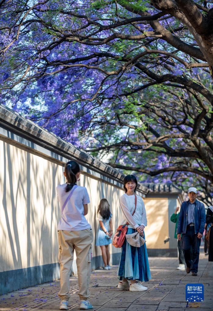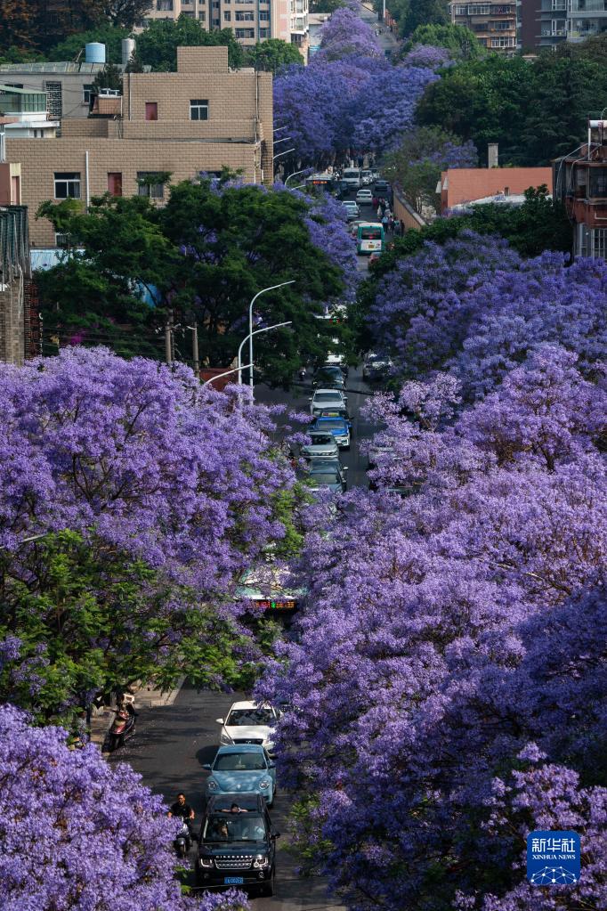 近日,位于云南省昆明市教场中路的蓝花楹绽放,吸引市民和游客前来拍照打卡。 新华社记者 陈欣波 摄