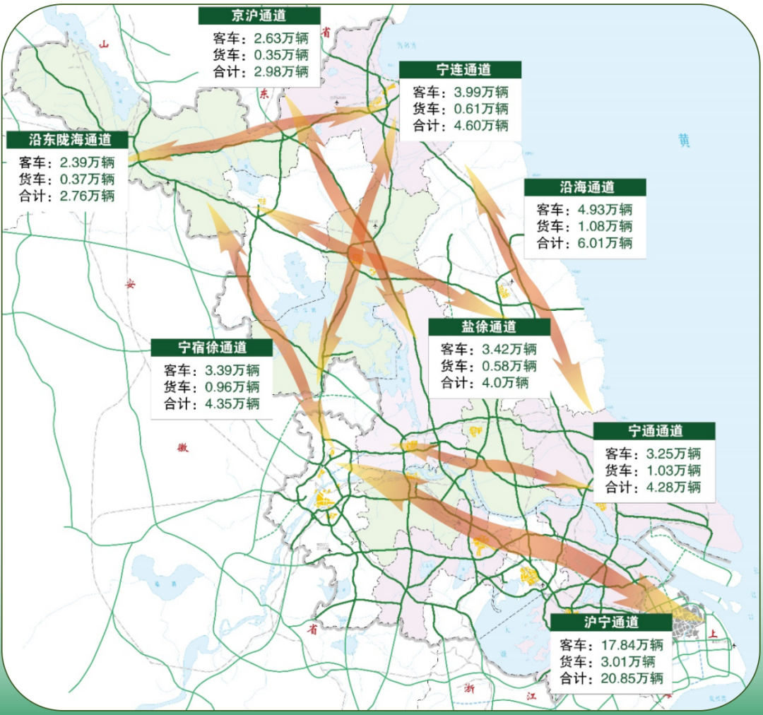 五一期间,因返乡、旅游客流增加,全省高速公路运输大通道流量将会明显增加,且小客车占比将会较平日高。预计“四纵四横”运输通道日均断面流量约50万辆,较平日增长约35%。此外,横向通道压力较大,主要集中在苏南的宁沪通道,日均断面流量最大,将超20万辆,达20.84万辆。