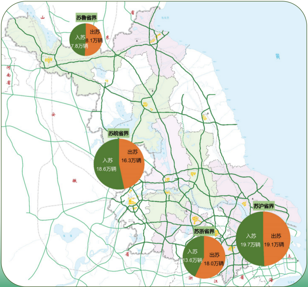 五一期间,预计江苏高速公路省界通道流量较大,出入江苏高速公路省界路段流量约为120万辆,较3月份日均流量增长35%左右。因山东省淄博市网络热点引力等因素影响,预计苏鲁省界节日期间增幅较大,日均流量接近16万辆;同时,周边相邻四省(市)中,进出上海的车辆最多,日均交通量约为38.8万辆。
