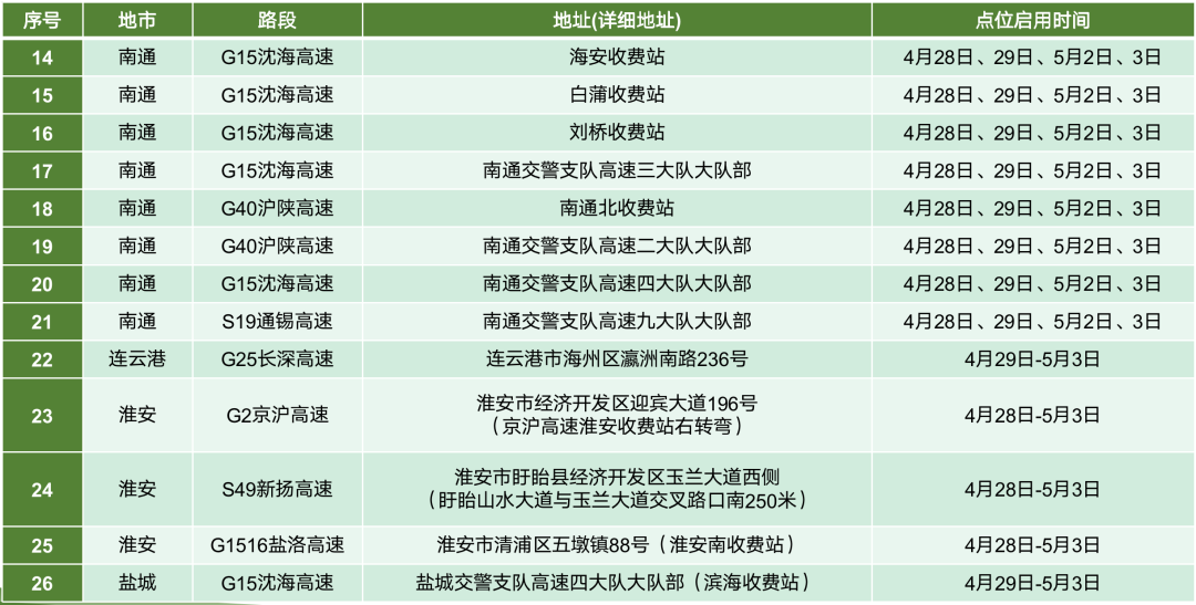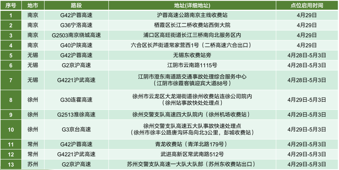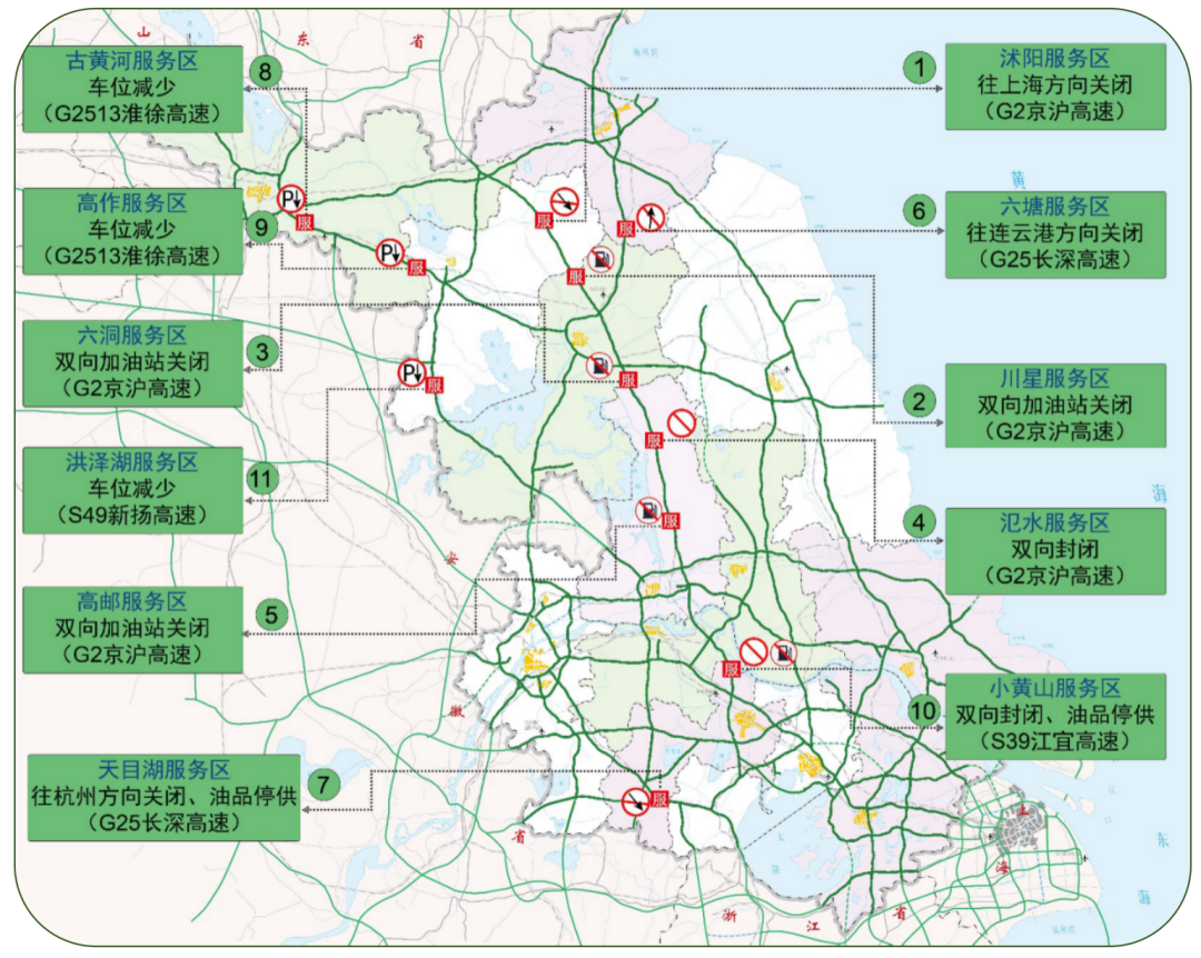 五一期间,G2京沪高速、G2513淮徐高速等高速公路沿线共有11个服务区有车位减少、服务区关闭等特情,请注意!