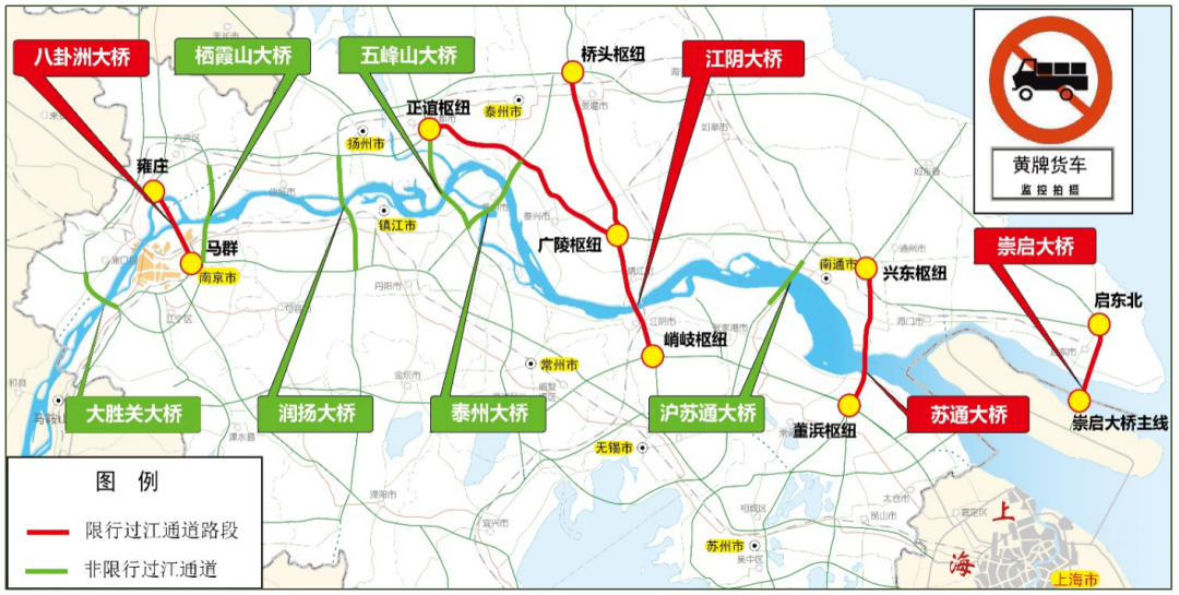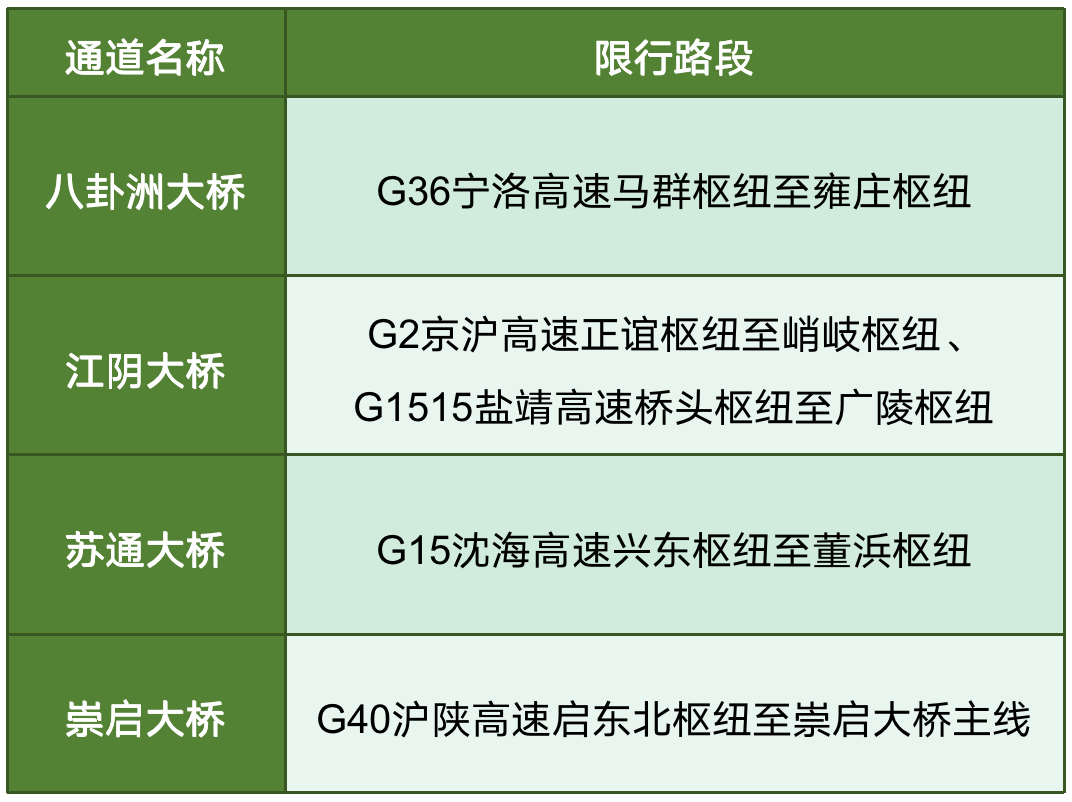 五一期间,八卦洲大桥、江阴大桥、苏通大桥、崇启大桥实施黄牌货车限时错峰出行政策,限行时段为4月28日12时—4月29日22时、5月2日和3日每日8时—22时,限行路段如下。