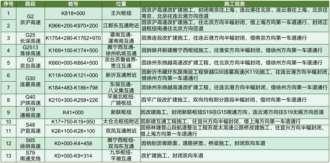 五一期间,省内有G30连霍高速、G40沪陕高速等13处高速公路施工路段、节点,请注意现场交通标志提示!