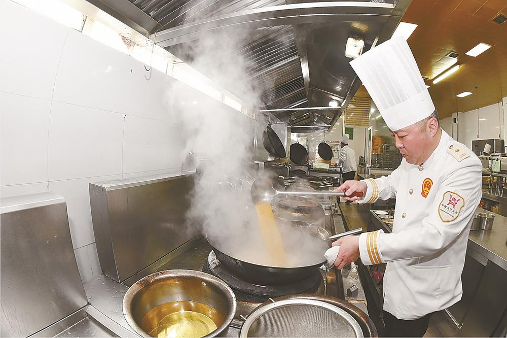 江苏省五一劳动奖章”获得者张林,是鸿基玄武酒店的行政总厨。多年来,他在本职岗位上埋头苦干,受到酒店领导和宾客的赞扬。为搞好烹饪技艺的传帮带,他先后带徒近20人,其中有12名学员先后获省市烹饪技能大赛特金奖。记者 单丹 摄
