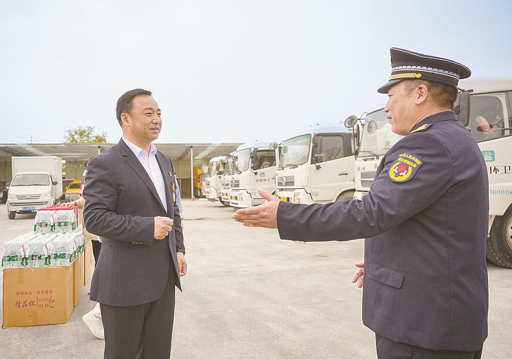 4月27日下午,市劳模、江苏佳运汽车集团有限公司总裁刘如山(左)带着慰问品来到盐城经济技术开发区环卫所,慰问一线环卫工人。2000年,刘如山响应国家关于企业改制的号召,下海创业,从无到有,把企业办成我省汽车流通行业的排头兵企业。 记者 单丹 韩宗明 摄