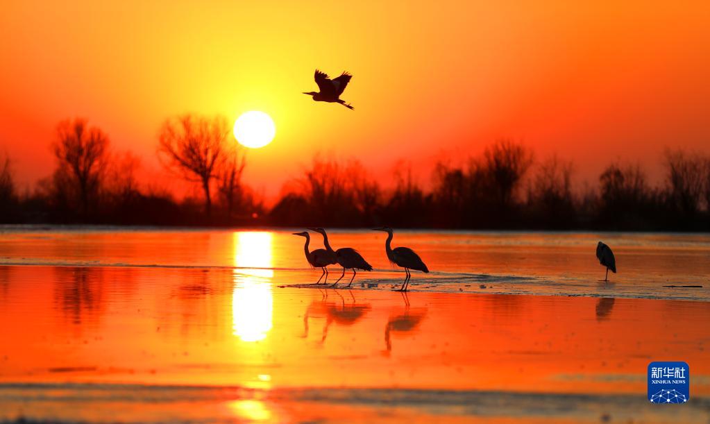 这是中国河北省衡水湖落日的资料照片(2022年12月29日摄)。 5月10日,中国邮政发行《中西建交五十周年》纪念邮票,画面表现了中国的衡水湖和西班牙的富恩特皮埃德拉湖,展现两国湖泊的旖旎风光和自然生态特征,意境清朗优美。 新华社发(王铁良摄)
