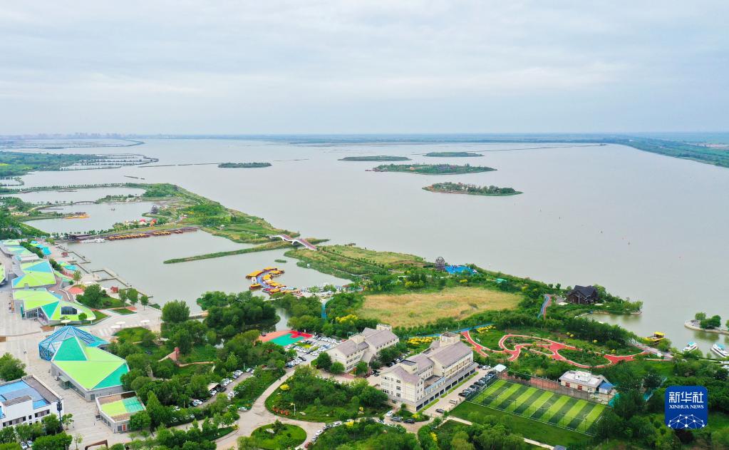 这是5月6日拍摄的中国河北省衡水湖(无人机照片)。 5月10日,中国邮政发行《中西建交五十周年》纪念邮票,画面表现了中国的衡水湖和西班牙的富恩特皮埃德拉湖,展现两国湖泊的旖旎风光和自然生态特征,意境清朗优美。 新华社记者 牟宇 摄