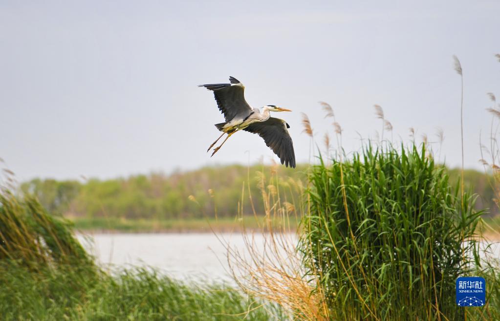 5月6日,苍鹭在中国河北省衡水湖飞翔。 5月10日,中国邮政发行《中西建交五十周年》纪念邮票,画面表现了中国的衡水湖和西班牙的富恩特皮埃德拉湖,展现两国湖泊的旖旎风光和自然生态特征,意境清朗优美。 新华社记者 牟宇 摄