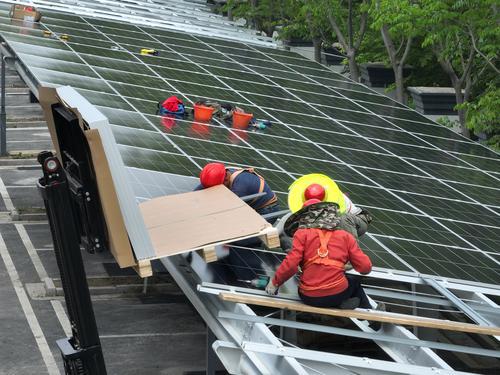今年以来,建湖县大力倡导“低碳办公、绿色出行”行动,积极推动企事业单位建设安装太阳能光伏停车棚。光伏车棚采用“自发自用、余电上网”模式,充分利用棚顶原本闲置的空间,全覆盖安装光伏板,光伏板产生的电能通过汇流箱统一收纳,再传输至逆变器将直流电变为交流电,其中绝大部分的电能被单位办公用电设备就近消纳,或用于车辆充电。通讯员 贾安东 盐阜大众报报业集团融媒体记者 单丹 摄
