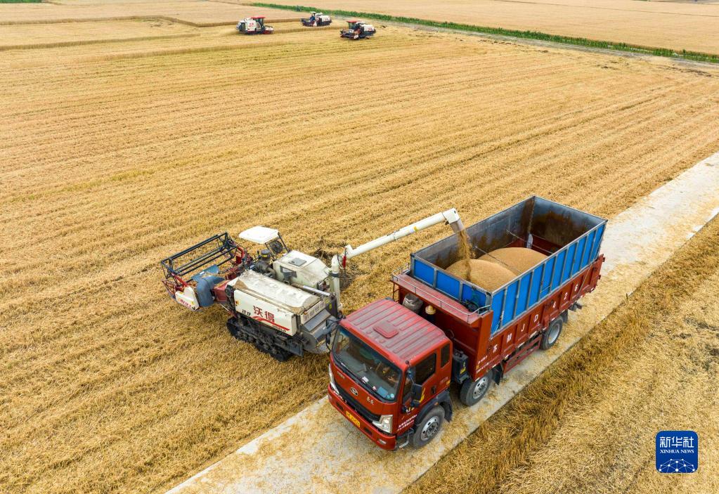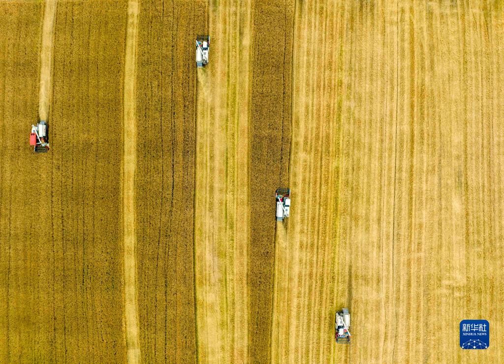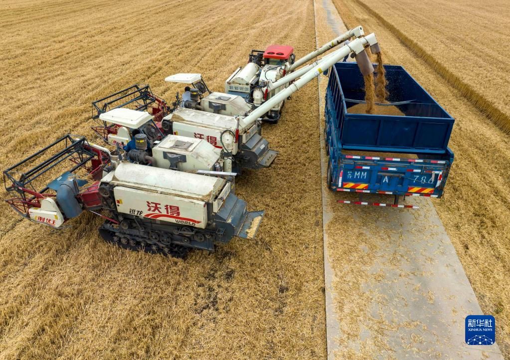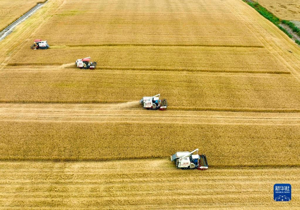 近日,江苏省泰州市255万亩小麦陆续进入收割期,当地农民抢抓晴好天气加紧收割。农机在田间穿梭,构成了一幅美丽的丰收图画。新华社发(汤德宏 摄)