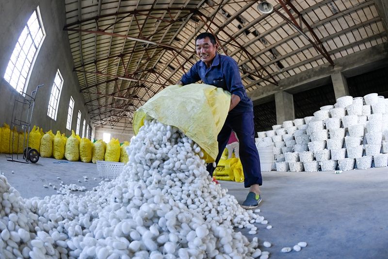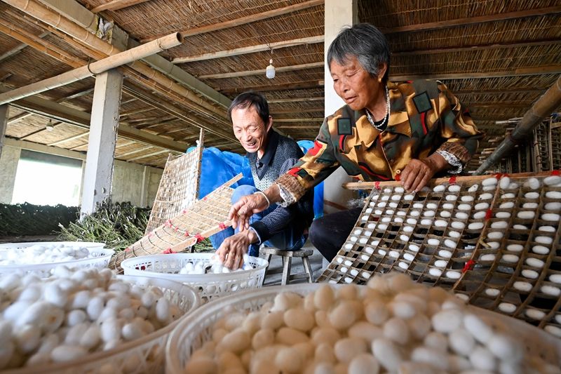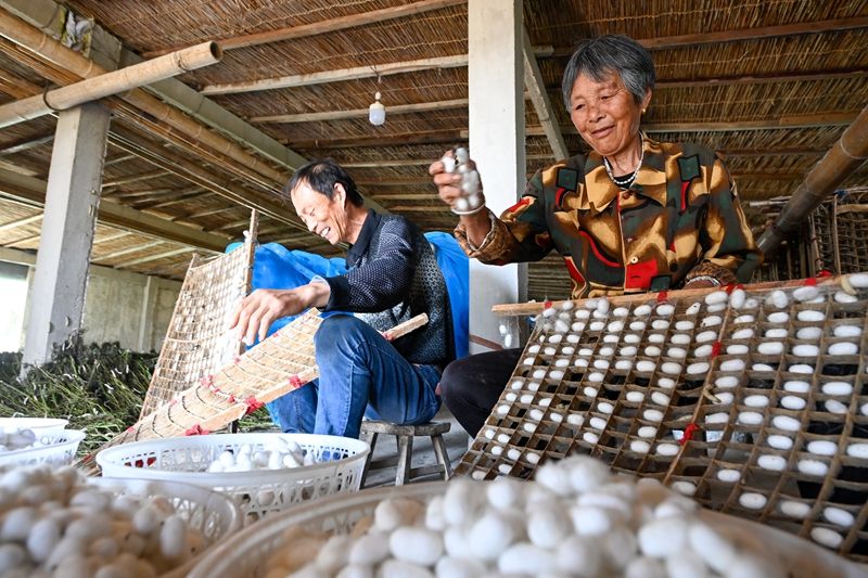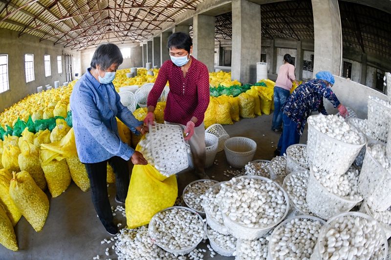 6月12日,射阳县特庸镇王村茧站里,村民们忙着称重、分装、打包蚕茧,一派繁忙景象。连日来,特庸镇春蚕蚕茧收购进入高峰期。特庸镇现有桑园3.6万亩,今年共计发放4.5万张春蚕,占射阳县春蚕发种量的90%,累计可收购鲜茧3.8万担左右。经初步检测,今年春茧干壳量、上茧率、净度等主要质量指标均创近几年最好水平,为常年批量生产5A、6A级高等级生丝提供了稳定的原料保障。盐阜大众报报业集团融媒体记者 周晨阳 摄