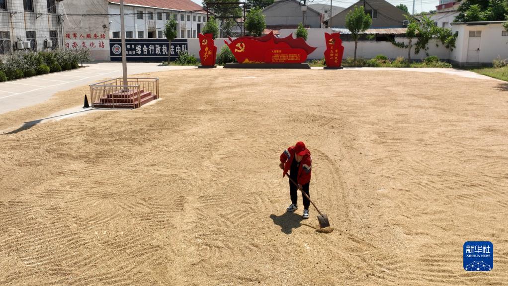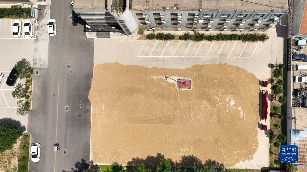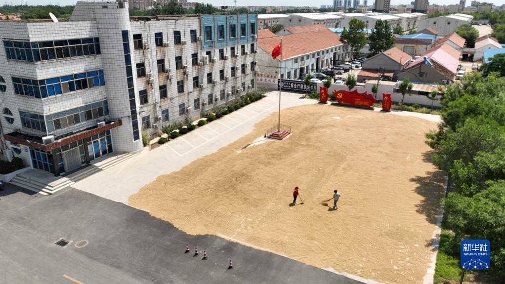 眼下正值麦收季节,山东省滨州市阳信县金阳街道办事处为解决农民晒粮难问题,临时开放办公楼广场等公共区域供农民晒粮。新华社发(霍向锋 摄)