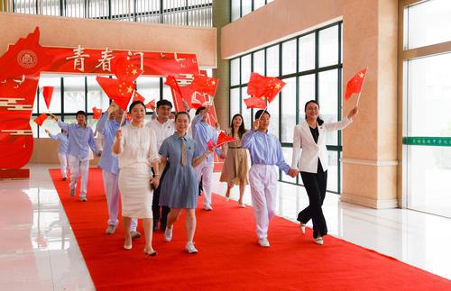 老师和家长代表与孩子一起走过青春门。6月29日上午,盐城市亭湖初级中学举行主题为《追求卓越展青春 志存高远创未来》的青春仪式,千名初二学子用一次青春的仪式让老师和家长见证自己朝气蓬勃的成长。 记者 周晨阳 摄