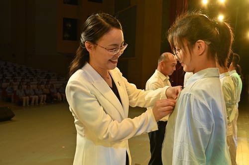 为新团员佩戴团徽6月29日上午,盐城市亭湖初级中学举行主题为《追求卓越展青春 志存高远创未来》的青春仪式,千名初二学子用一次青春的仪式让老师和家长见证自己朝气蓬勃的成长。 记者 周晨阳 摄