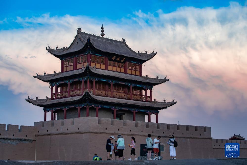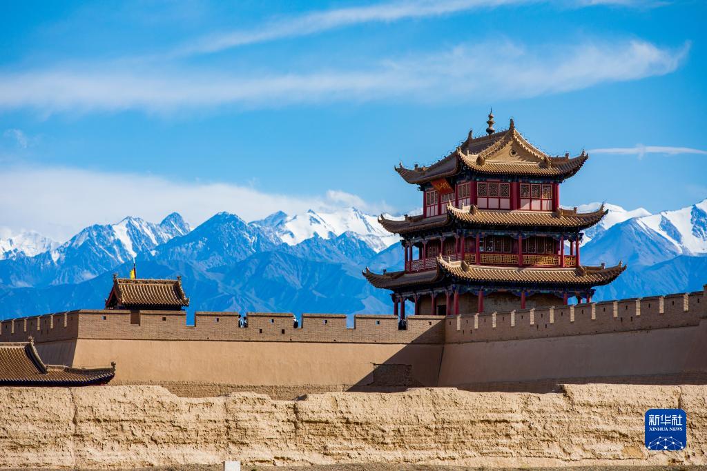 这是7月19日拍摄的祁连雪山与嘉峪关关城。 当日,位于甘肃河西走廊的嘉峪关市在一场疾风骤雨后,天空放晴,远处祁连雪山与嘉峪关关城交相辉映,构成一幅壮美画卷。 新华社记者 郎兵兵 摄