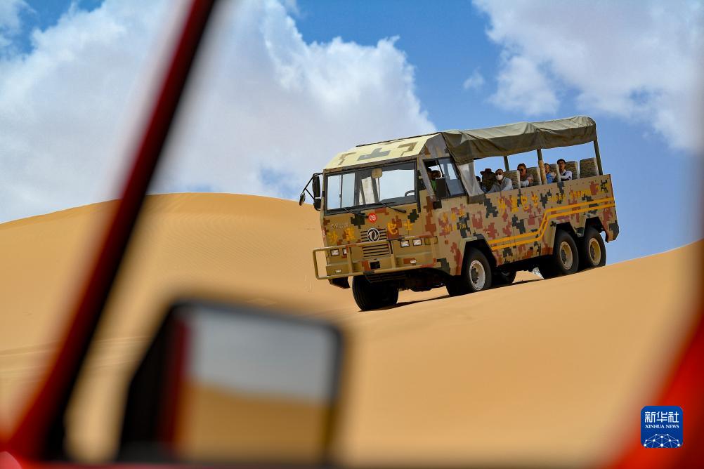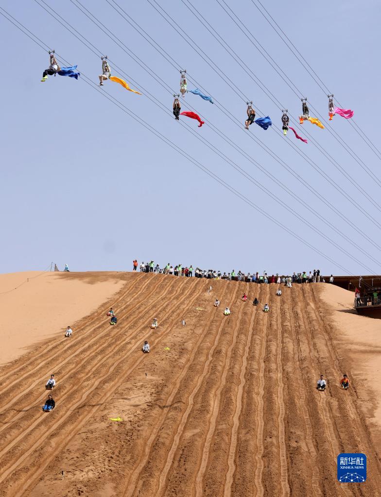 盛夏时节,地处黄河之畔与腾格里沙漠边缘的宁夏中卫市沙坡头景区迎来大批游客,人们在这里体验羊皮筏子漂流、沙漠冲浪、滑沙、沙漠观星等项目。据了解,进入暑期,宁夏中卫市沙坡头景区客流量大幅增长,日客流量最高超过1万人次。 新华社记者 王鹏 摄