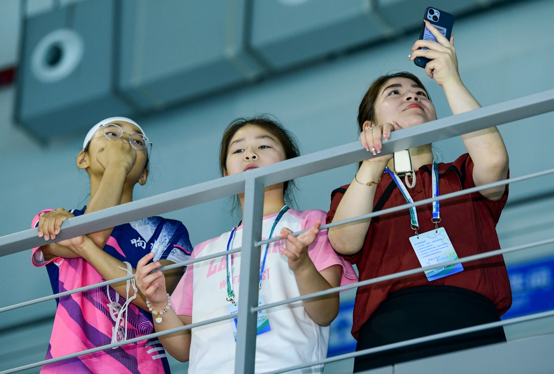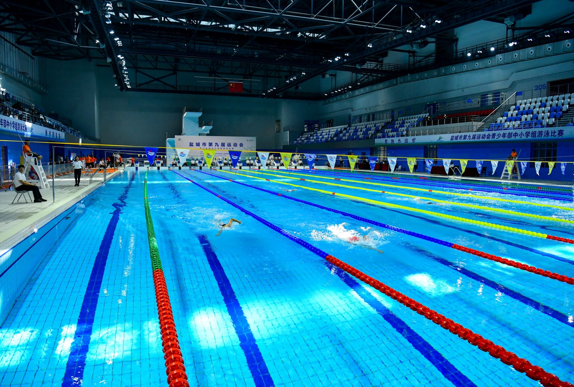 8月24日上午,在奥体中心游泳馆,市九运会青少年部中小学组游泳比赛顺利收官。赛场上,游泳小将们你追我赶,破浪前行,一场水中的速度与激情燃情上演。两侧的观众席上更是热闹非凡,呐喊声、掌声、欢笑声此起彼伏,大家都在用自己的方式为心中的冠军加油打气。盐阜大众报报业集团记者 杨毅 摄