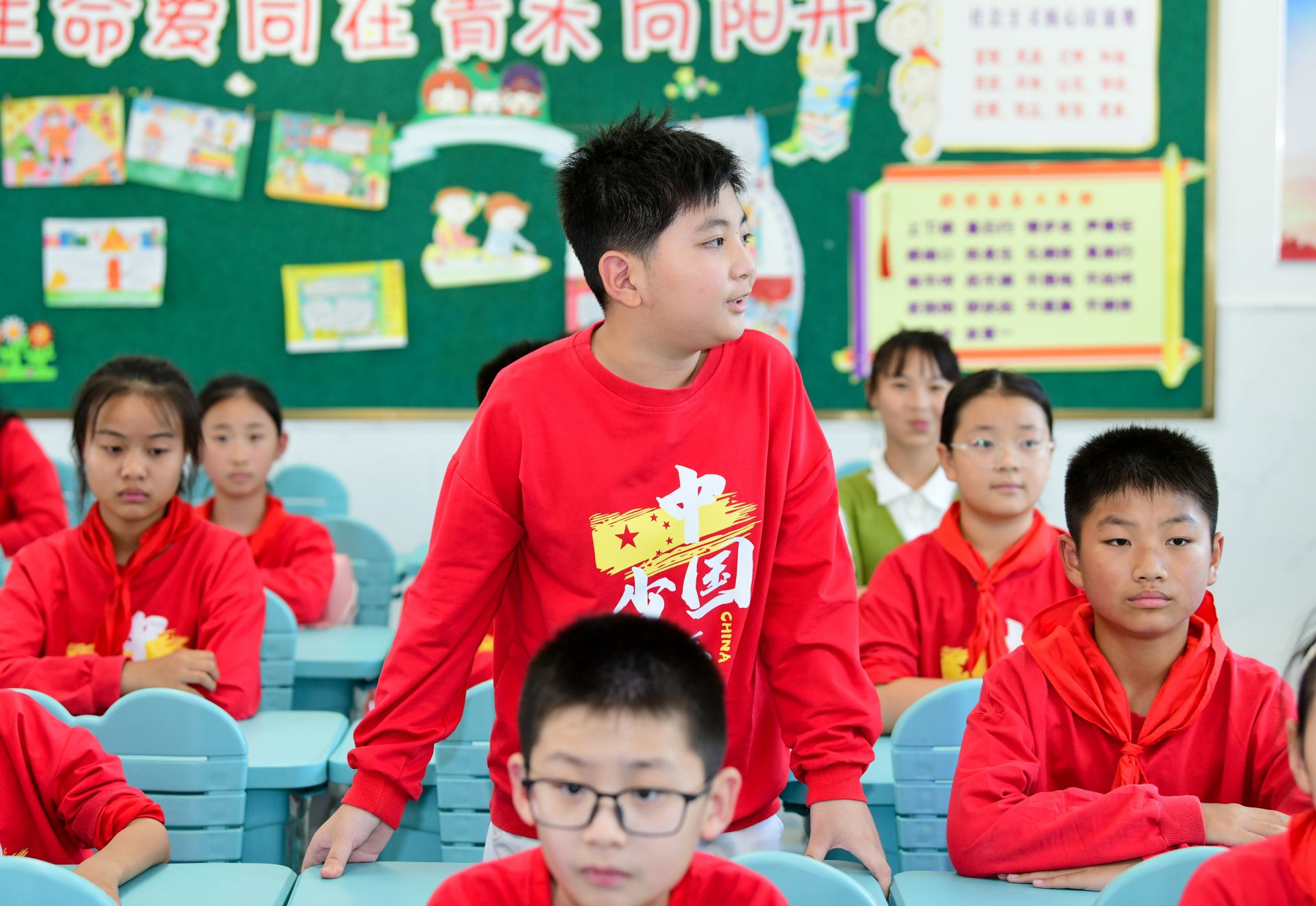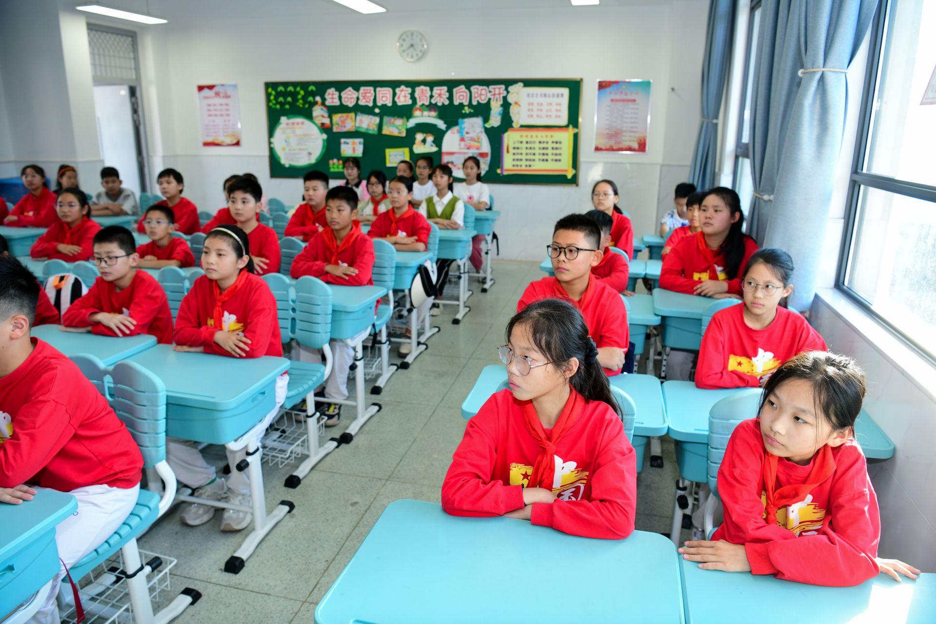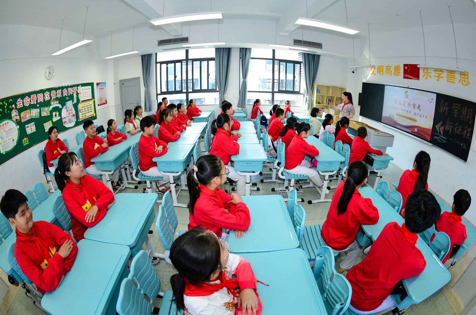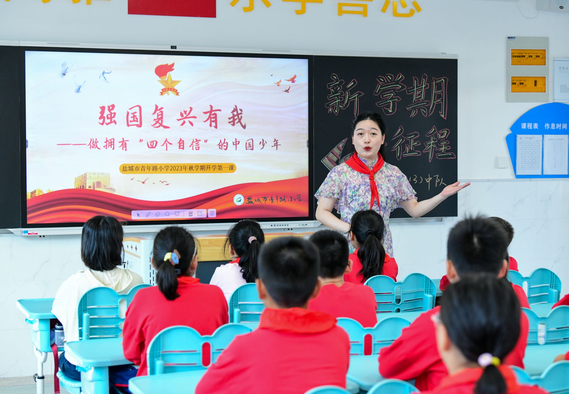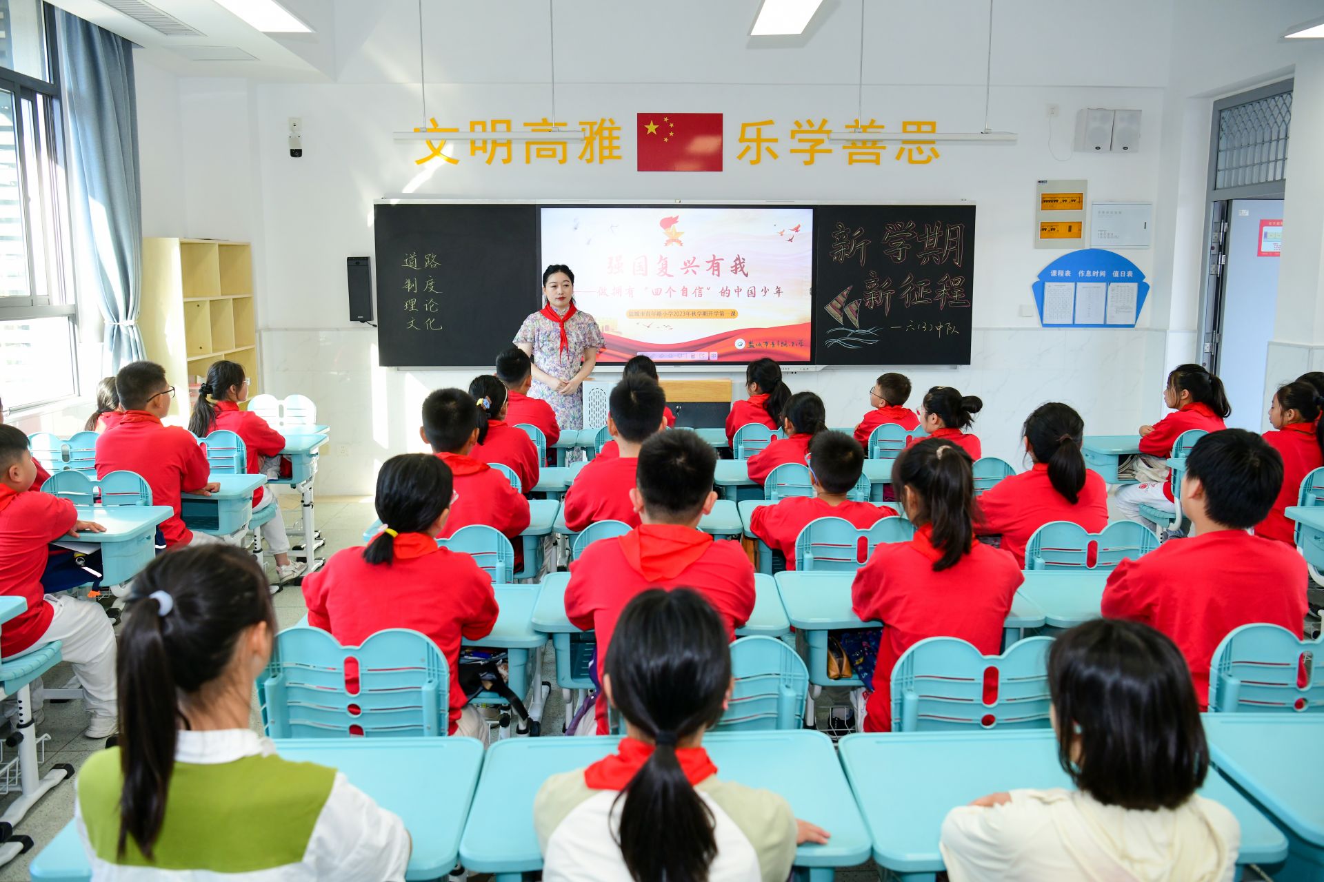 9月1日,在盐城市青年路小学六(3)班教室,老师给学生上了一堂以“强国复兴有我”为主题的班会课,引导学生更好认识和认同中华文明,铸牢中华民族共同体意识,增强做中国人的志气、骨气、底气,鼓舞广大青少年博学笃行,投身强国建设、民族复兴的新征程。杨毅 摄