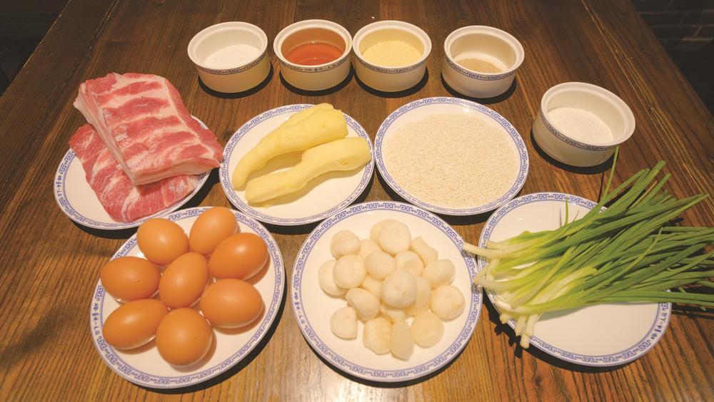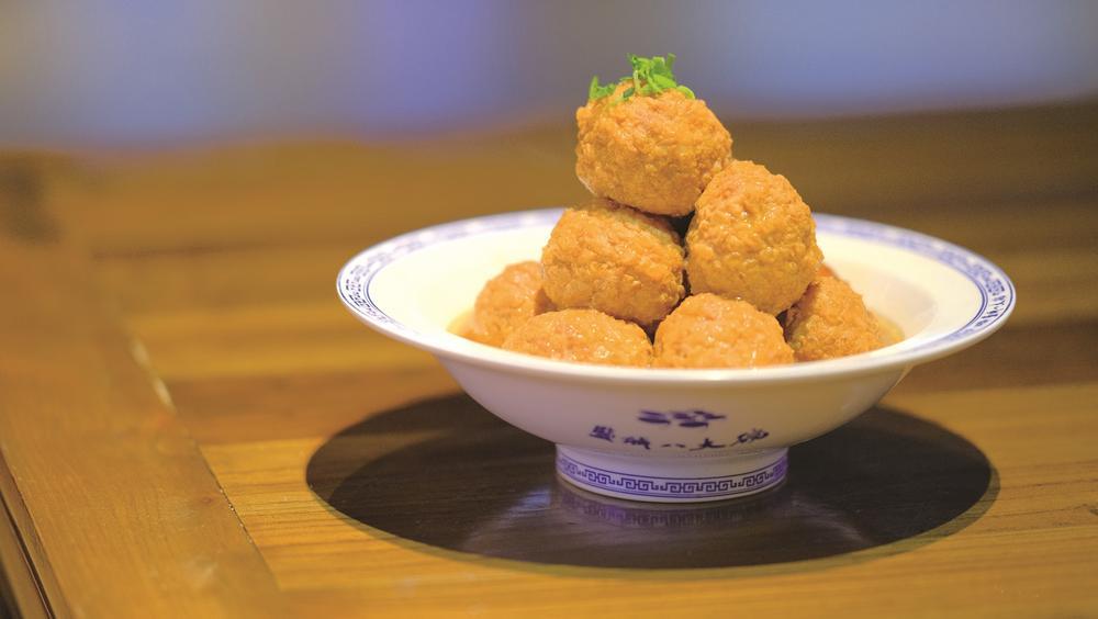 糯米肉圆,“八大碗”中必不可少的一碗。糯米与猪肉的结合可以说是天作之合,口感软糯绵密,肉的香味与糯米的清香,一整个肉圆吃下去也不会觉得腻。精选的糯米浸泡3小时,再上锅蒸1个小时,蒸好的糯米饭放凉之后,将猪肉、鸡蛋、盐、姜、鸡精、葱倒入盆里,搅拌均匀,搓成圆形。锅里油温烧至六成热之后放入肉圆,用文火炸至金黄色之后捞出。等油温再次烧热,炸第二次,肉圆呈深黄色后捞出。按盐城当地的做法,往往还会放入汤汁中微火再煨6个小时,使之更加入味。