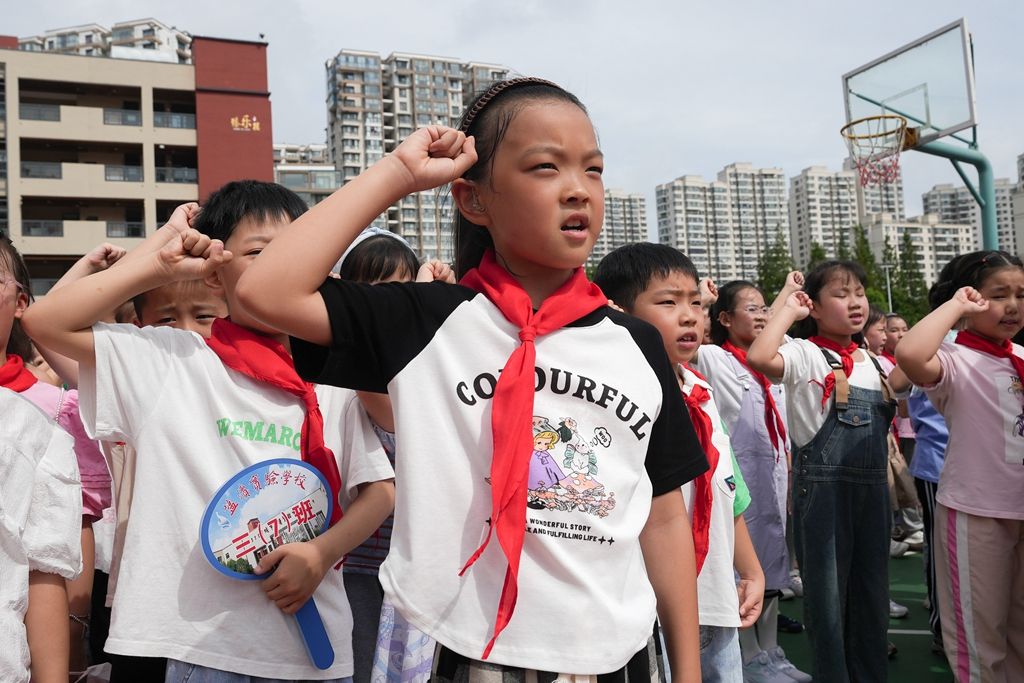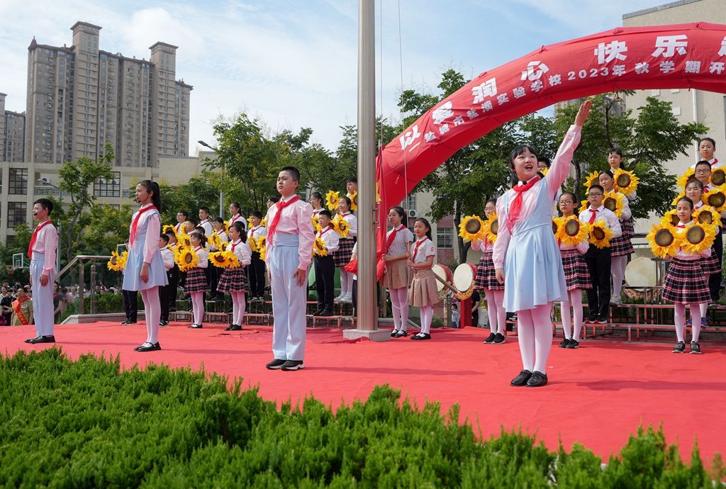 发出新学期的誓言:少年智则国智,少年强则国强。9月4日上午,市盐渎实验学校举行2023年秋学期“以爱润心 快乐起航”开学典礼,全体师生欢聚一堂,带着对暑假生活的美好回忆,带着对新学期的无限憧憬,共同开启新的一学年。盐阜大众报报业集团融媒体记者 周晨阳 摄