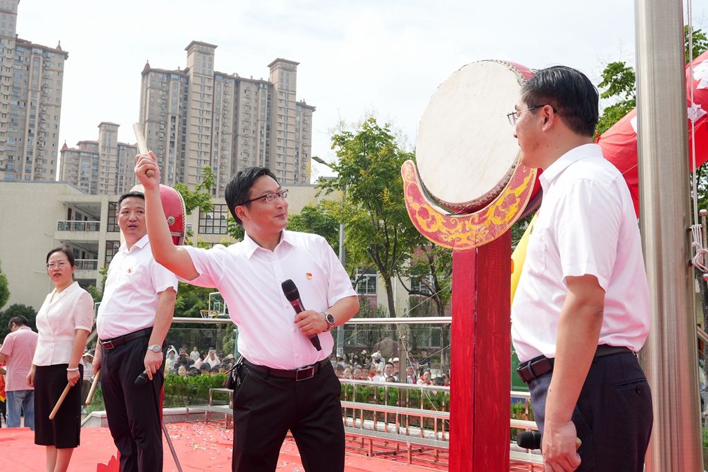 校长击鼓为7400名学子加油鼓劲。9月4日上午,市盐渎实验学校举行2023年秋学期“以爱润心 快乐起航”开学典礼,全体师生欢聚一堂,带着对暑假生活的美好回忆,带着对新学期的无限憧憬,共同开启新的一学年。盐阜大众报报业集团融媒体记者 周晨阳 摄