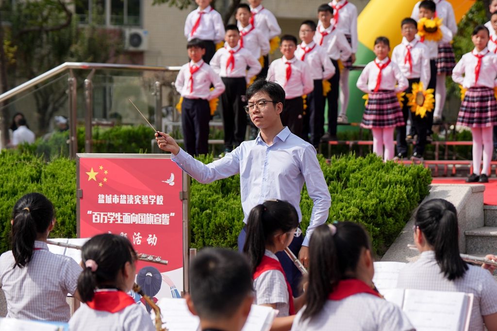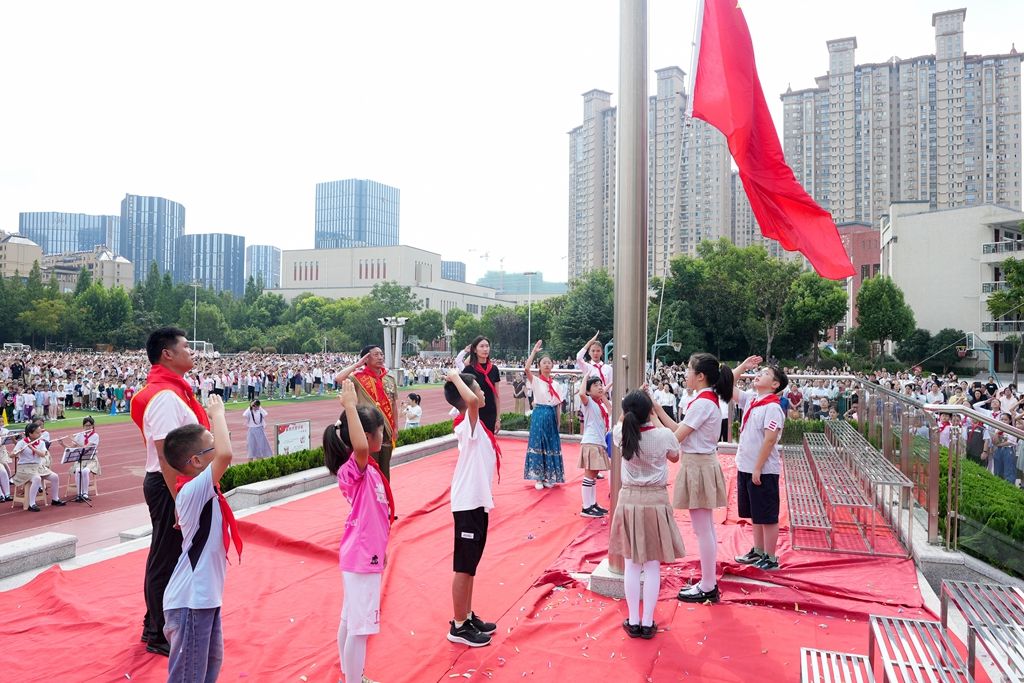 全体师生以及校外辅导员一起参加庄严的升旗仪式。9月4日上午,市盐渎实验学校举行2023年秋学期“以爱润心 快乐起航”开学典礼,全体师生欢聚一堂,带着对暑假生活的美好回忆,带着对新学期的无限憧憬,共同开启新的一学年。盐阜大众报报业集团融媒体记者 周晨阳 摄