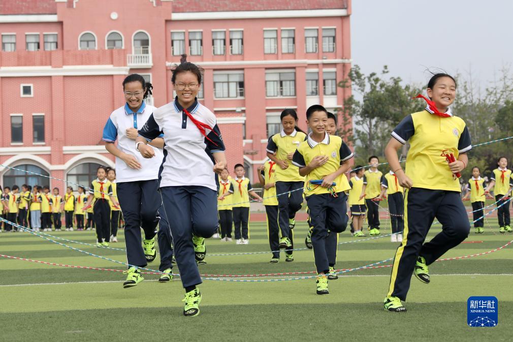 9月7日,山东省青岛西海岸新区弘德学校学生在大课间练习跳绳。 新学期开始,山东省青岛市积极落实“双减”政策,全面推进学生素质教育,利用大课间组织学生开展足球、跳绳、乐器等文体活动,让学生在丰富多彩的大课间中陶冶情操,快乐成长。 新华社发(王培珂 摄)