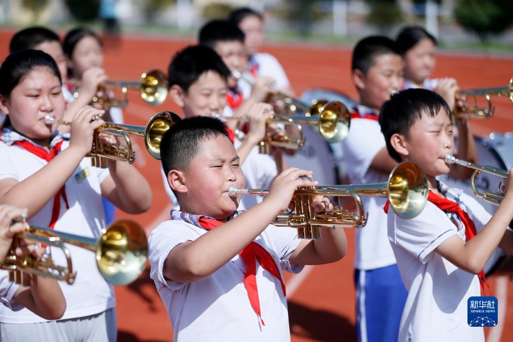 9月7日,山东省青岛市即墨区龙山中心小学的学生在学习吹号。 新学期开始,山东省青岛市积极落实“双减”政策,全面推进学生素质教育,利用大课间组织学生开展足球、跳绳、乐器等文体活动,让学生在丰富多彩的大课间中陶冶情操,快乐成长。 新华社发(梁孝鹏 摄)