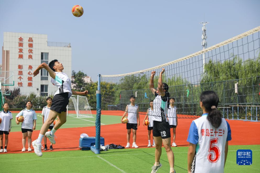 9月7日,山东省青岛第三十三中学的学生在进行排球训练。 新学期开始,山东省青岛市积极落实“双减”政策,全面推进学生素质教育,利用大课间组织学生开展足球、跳绳、乐器等文体活动,让学生在丰富多彩的大课间中陶冶情操,快乐成长。 新华社发(张鹰 摄)