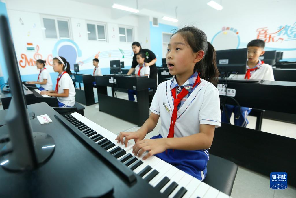 9月7日,山东省青岛市即墨区龙山中心小学的学生在学习弹钢琴。 新学期开始,山东省青岛市积极落实“双减”政策,全面推进学生素质教育,利用大课间组织学生开展足球、跳绳、乐器等文体活动,让学生在丰富多彩的大课间中陶冶情操,快乐成长。 新华社发(梁孝鹏 摄)