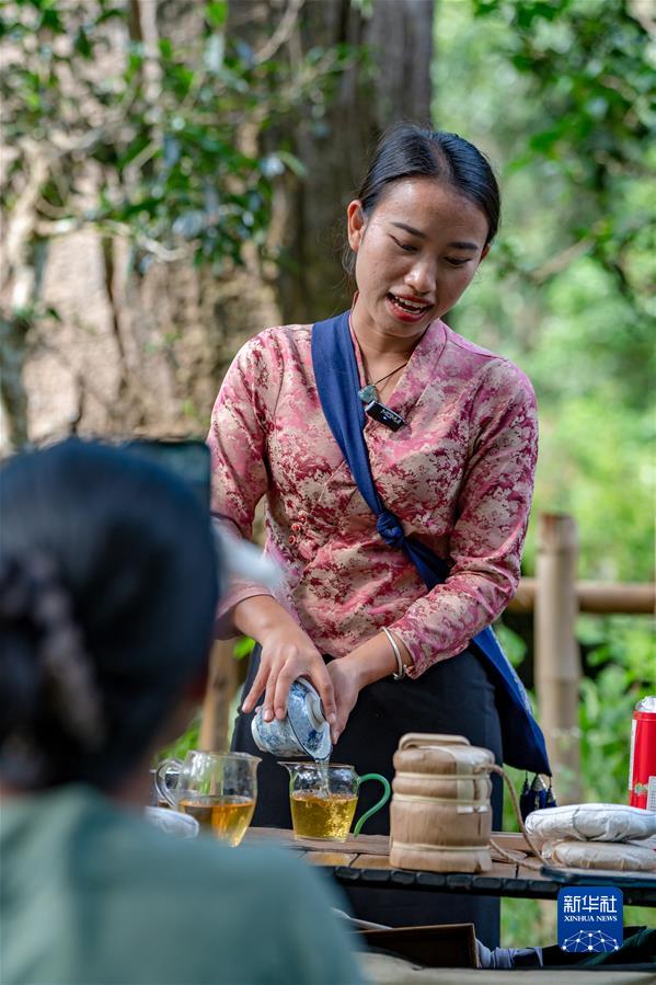 在景迈山大平掌古茶林,一位傣族姑娘在直播卖茶(9月14日摄)。新华社记者 胡超 摄