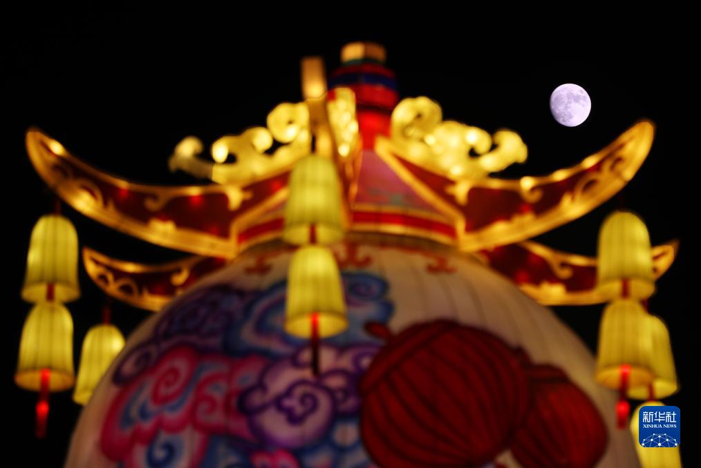 9月27日,一轮明月镶嵌在南岳祝融彩灯艺术展上空。国庆节到来之际,湖南省衡阳市南岳区在祝融文旅小镇举办彩灯艺术节。 新华社发(曹正平摄)