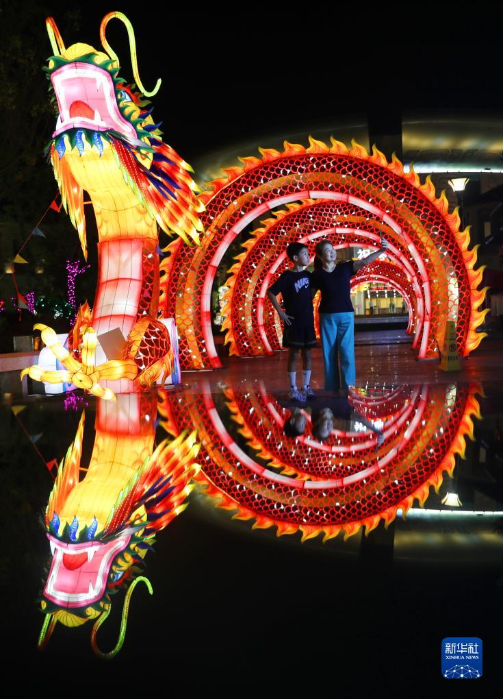 9月27日,游客在南岳祝融彩灯艺术展上打卡游玩。 国庆节到来之际,湖南省衡阳市南岳区在祝融文旅小镇举办彩灯艺术节。 新华社发(曹正平摄)