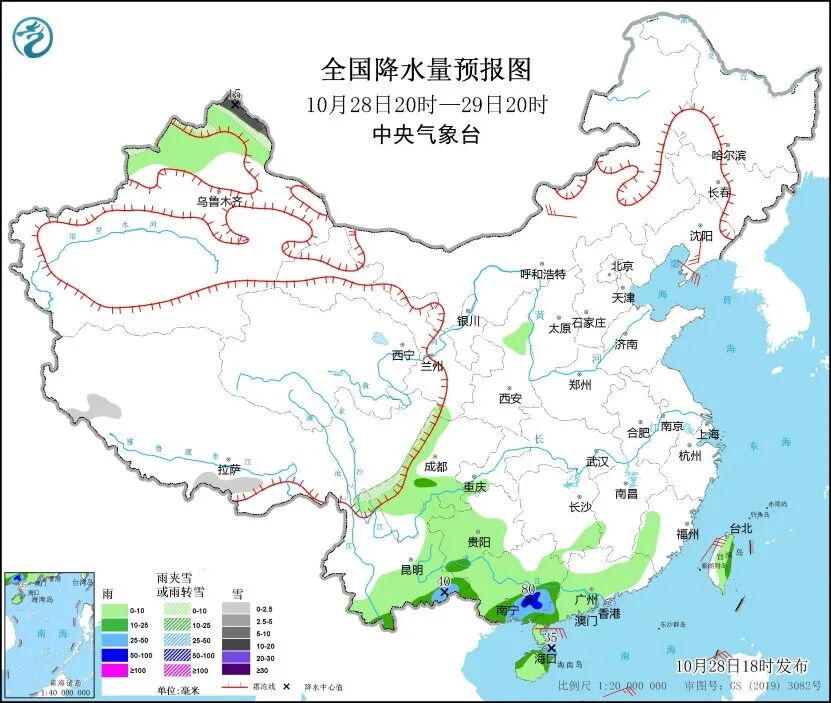 10月28日20时至29日20时,新疆北疆北部、西藏南部等地部分地区有小到中雪或雨夹雪,其中,新疆阿勒泰等地有大雪,部分地区暴雪;云南东南部、广西东部和南部、广东西部、海南岛北部等地部分地区有中到大雨,其中,广西东南部等地部分地区有暴雨。